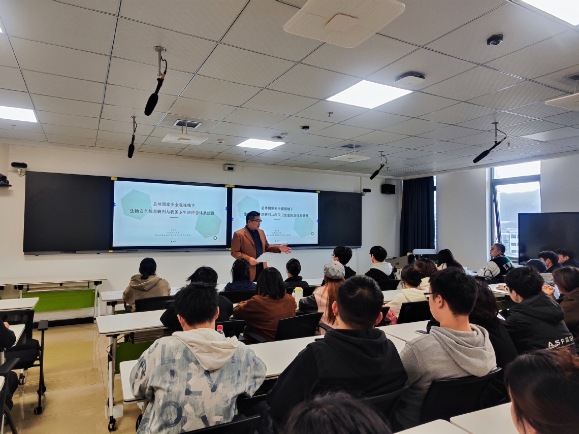 本网讯(通讯员 袁青芝)为进一步深化师生对总体国家安全观的理解,推动生物安全治理与公共卫生应急法治建设的前沿探讨,11月8日,太阳成tyc7111cc集团特邀西南政法大学许浩然博士来院开展题为《总体国家安全观视域下生物安全信息研判与我国卫生法应急体系建设》的讲座。本次讲座由学院党委副书记陈晓林主持,学院四十余名师生现场聆听。