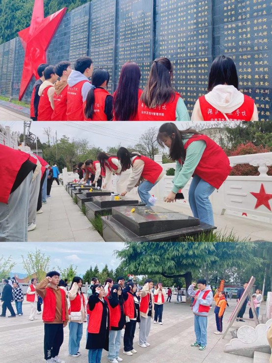 到达郧阳区革命烈士陵园后,公卫学院的志愿者依次瞻仰烈士英名墙,仔细查看墙上刻着的英雄人物的名字。此后全体志愿者们在革命英雄纪念碑前庄严宣誓,牢记团员义务和责任。并在烈士墓前向革命烈士献出自己所做的小白花并集体默哀三分钟。然后全体志愿者积极学习陵园历史,有序参观陵园,认真清扫陵园。最后由负责人清点志愿者人数并带领志愿者乘车回到学校。