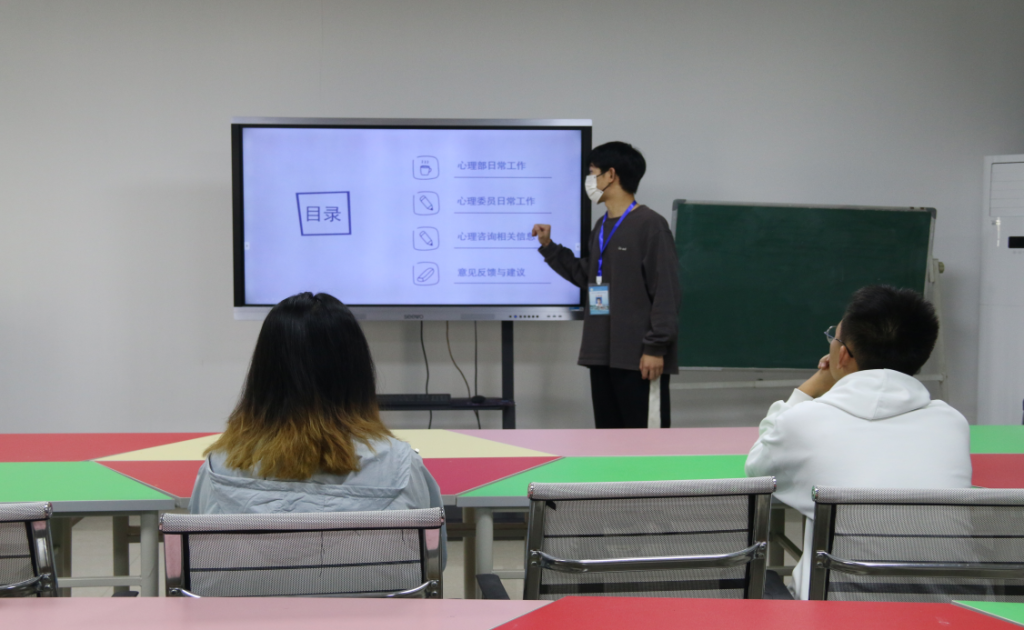 活动分为“心理部日常工作”“心理委员日常工作”“心理咨询相关信息介绍”“心理委员意见及反馈”四个环节。其中,在“心理委员日常工作”部分,学生会心理部部长袁新宇从“心理委员应具备的条件”“心理委员的语言沟通方法”等方面向各班心理委员详细介绍了心理委员的具体工作内容,并同各班心理委员进行了交流互动。