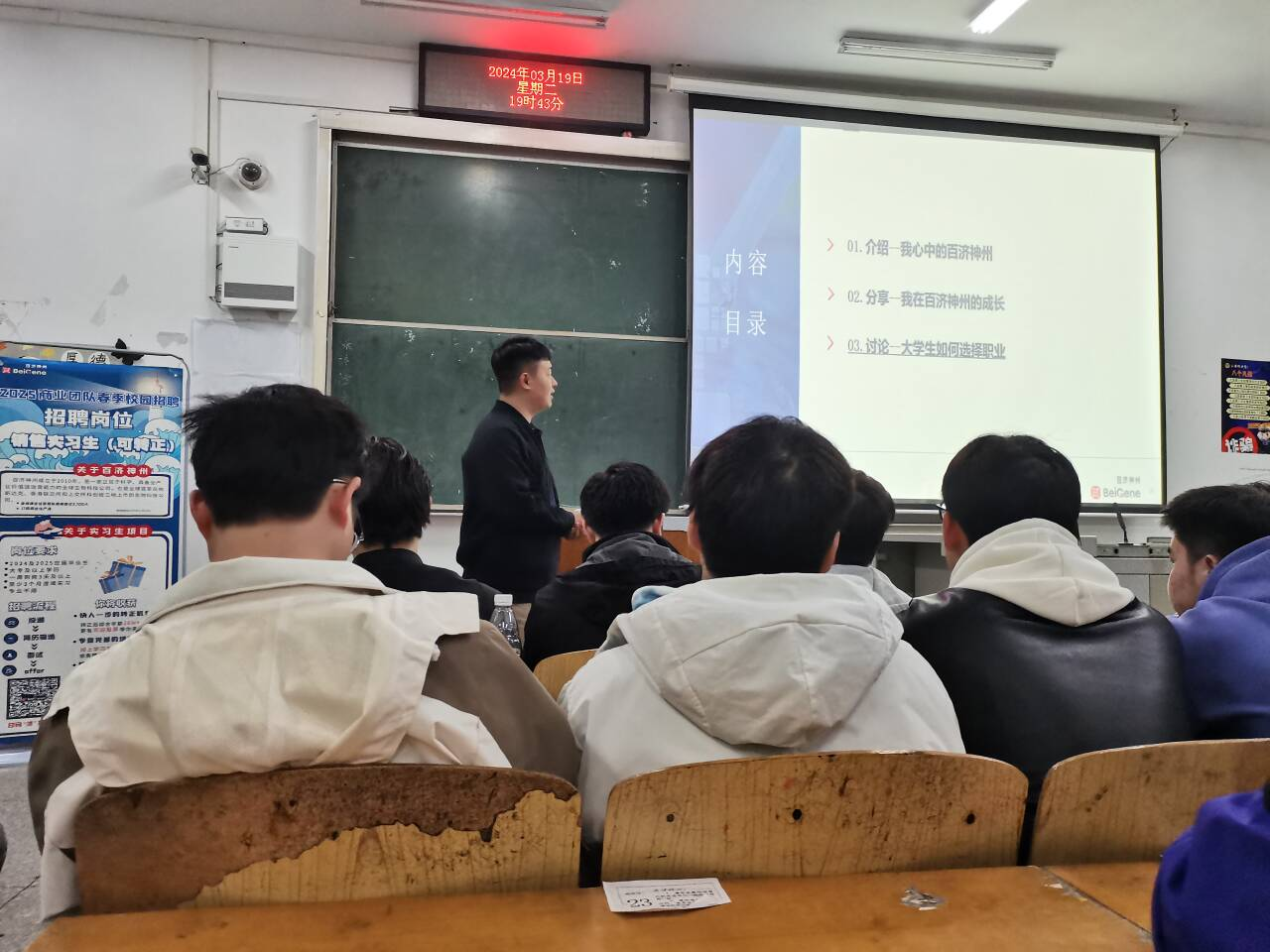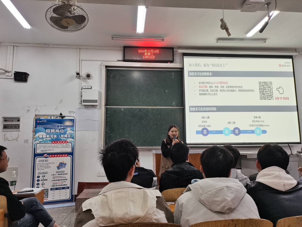 为深入贯彻国家两会精神,实现高校毕业生高质量充分就业,3月19日,太阳成tyc7111cc集团在5404教室举办百济神州生物科技公司湖北医药学院专场招聘会。太阳成tyc7111cc集团分党委副书记牛佳、毕业班辅导员及公卫学院、药学院2020级、2021级学生参加招聘会。