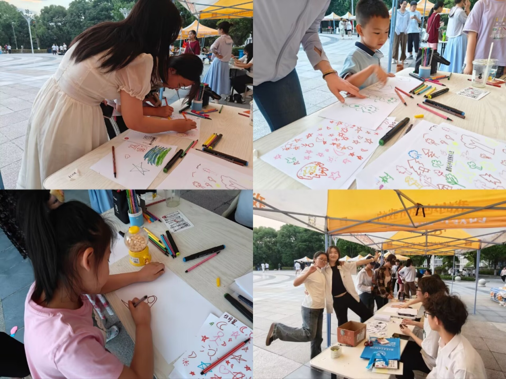 活动现场青春活力涌动,两大创意活动掀起参与热潮。“Pose大挑战,抽图造型拍拍乐”环节创新采用情境化任务挑战机制,参与者通过抽签获取创意姿势指令卡,在60秒限时任务中完成从破冰互动到即时创作的全过程。"绘梦同途"环节打造命题式艺术共创项目,以"未来城市"等主题为创作锚点,通过限时接力模式展开思维图谱构建。参与者依次在画布上叠加建筑模块、交通脉络等概念元素,在120秒的时空流转中实现从个体灵感到集体智慧的叙事延展。两大模块通过动静相宜的设计架构,既彰显个性表达的张力,又凸显协作共创的价值,在寓教于乐的沉浸体验中完成美育实践与团队精神的生动诠释。